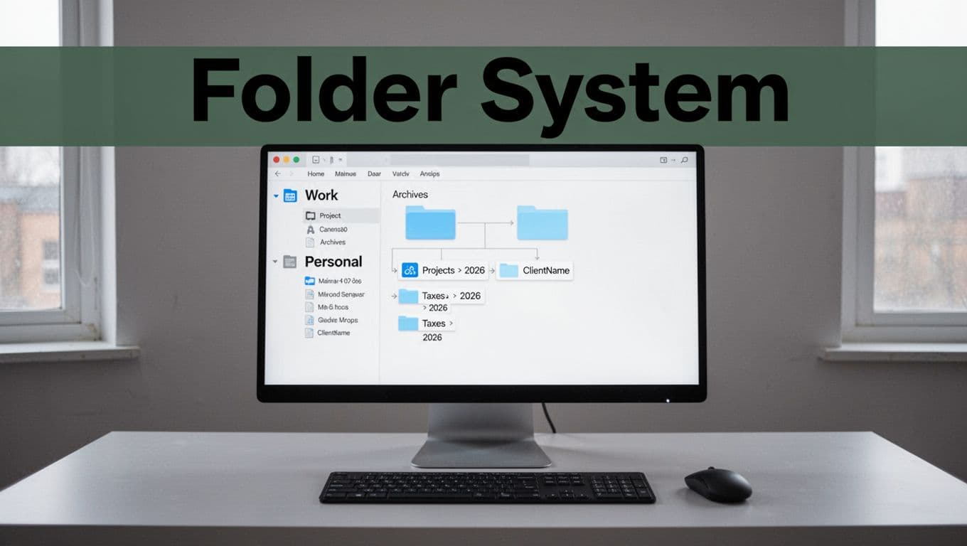 2026 > ClientName’ and ‘Taxes > 2026’. A keyboard and mouse are nearby, with a bold ‘Folder System’ headline on a dark-green band.” />If you want more ideas, this guide on organizing your workspace can help you sanity-check your structure: organizing your digital workspace.